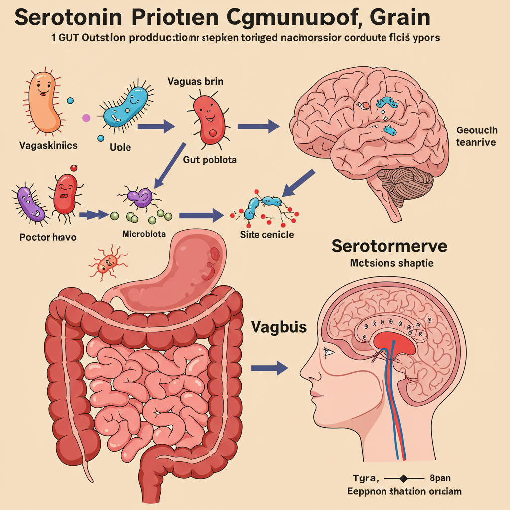 장 내 미생물은 뇌에 작용하는 신경전달물질, 특히 세로토닌의 생산에도 일부 관여합니다.